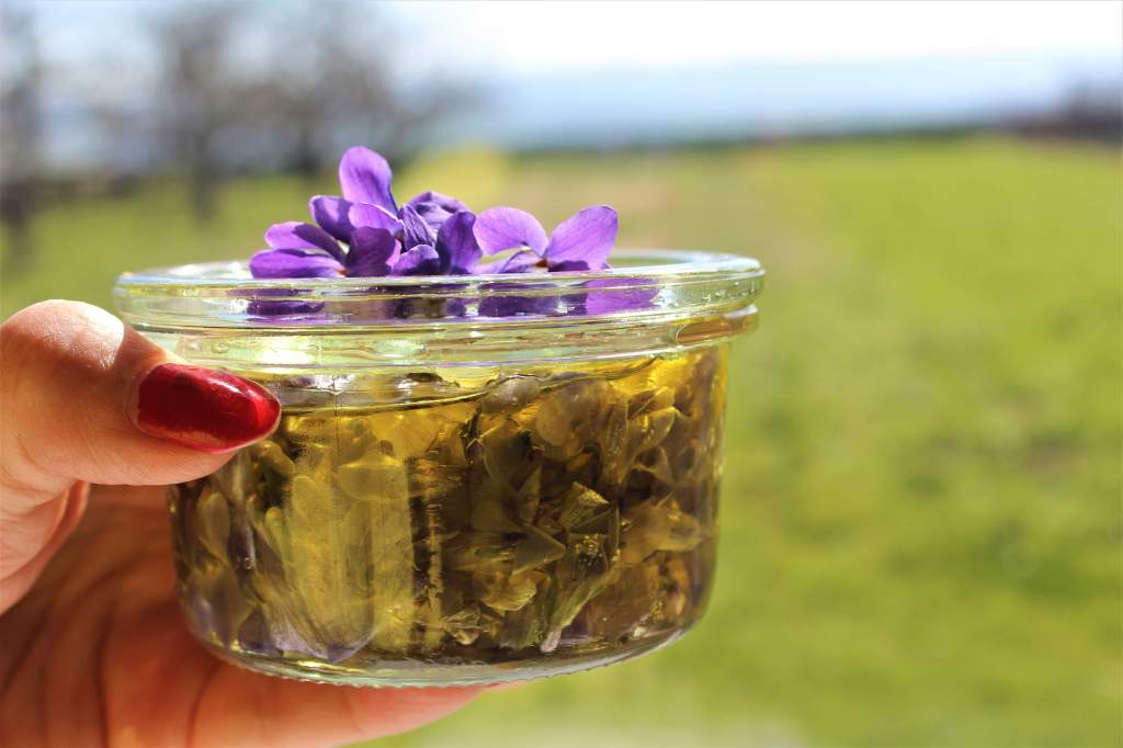 - hrst fialek zalij olivovým olejem a uzavři do skleničky