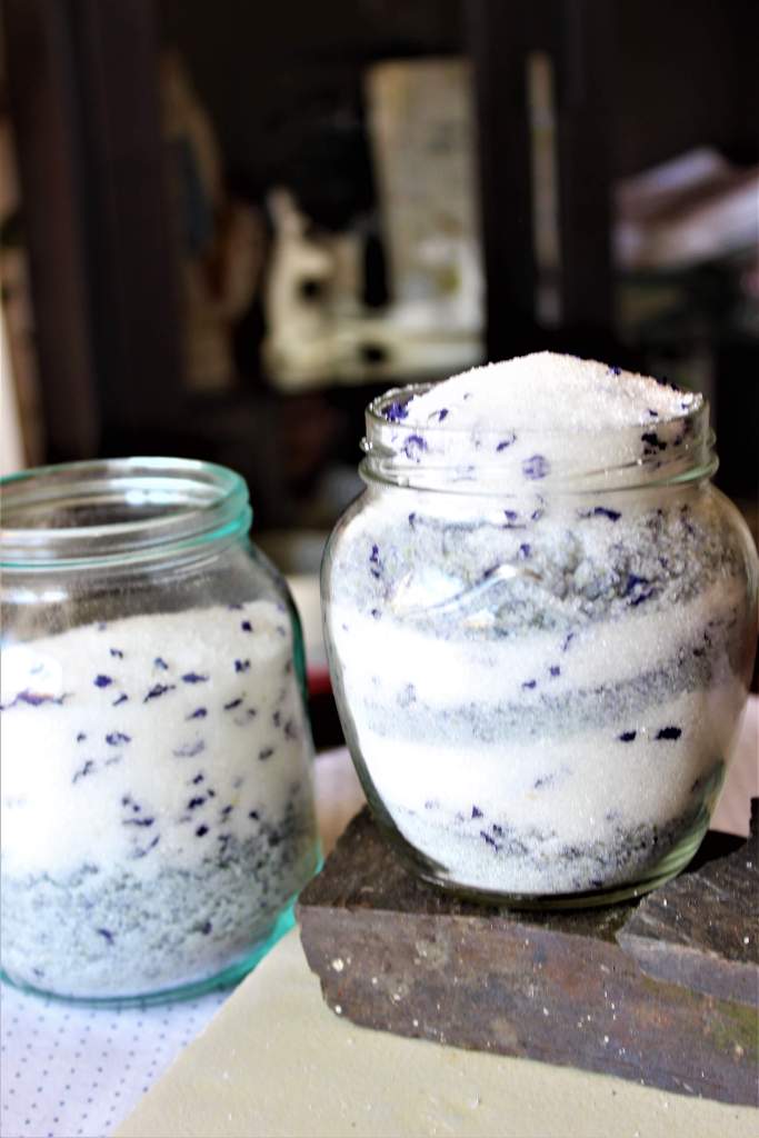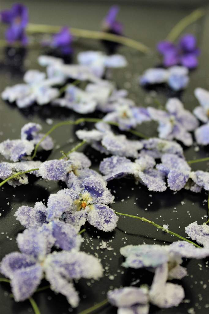 - fialový cukr vyrobíš mírným rozmixováním fialek a cukru