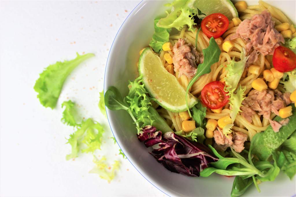 - Naservíruj na talíř, přidej kukuřici, salát tuňáka a ještě zakápni limetkou.