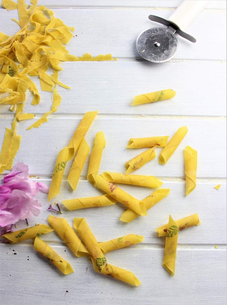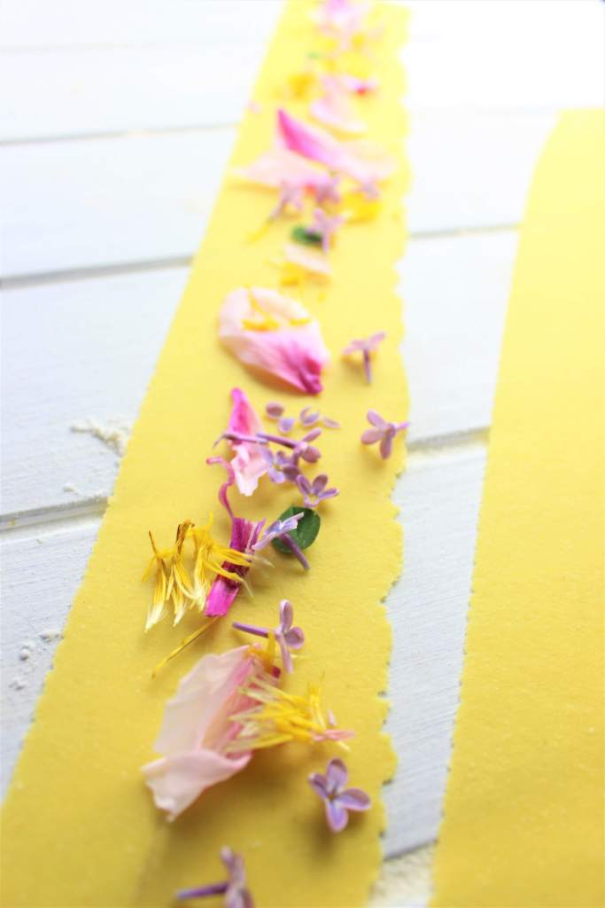 Já osobně mám doma strojek na vyvalování těsta, tudíž jsem ve výhodě 🙂 Určitě to ale zvládneš i bez strojku. Pokud máš obavu, že květy nezapracuješ, tak je jednoduše nazdob přímo na těstoviny. Je to opravdu moc dobré a ta svěží chuť jara ti bude znít v ústech ještě dlouho 🙂 Mňam