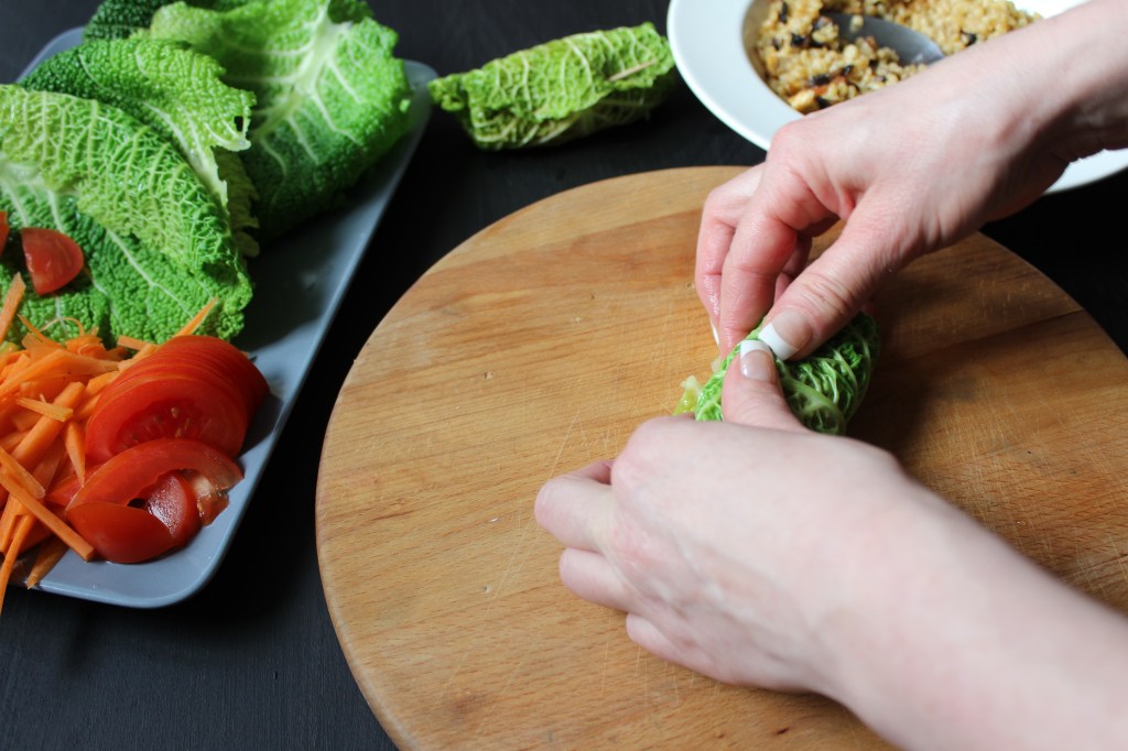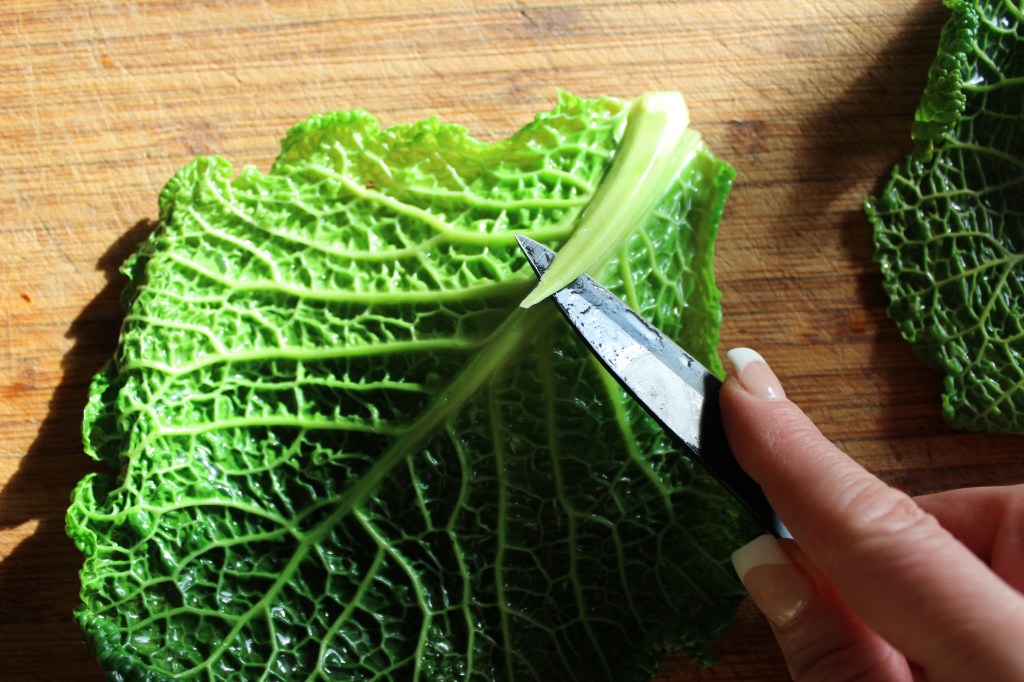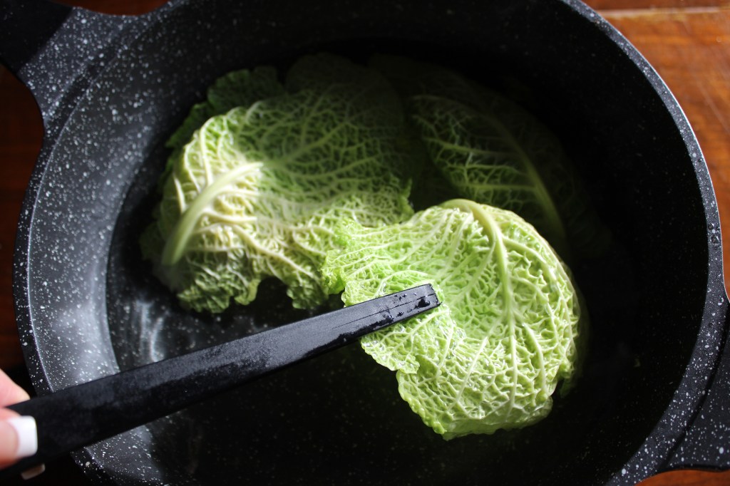 Nyní se dej vařit osolenou vodu. Do vřelé vody ponoř listy kapusty, poté je dej okapat na talíř. Vem malý nůž a opatrně odřízni tu tlustou část listu. List se musí dát pěkně motat, tak aby nepraskal.