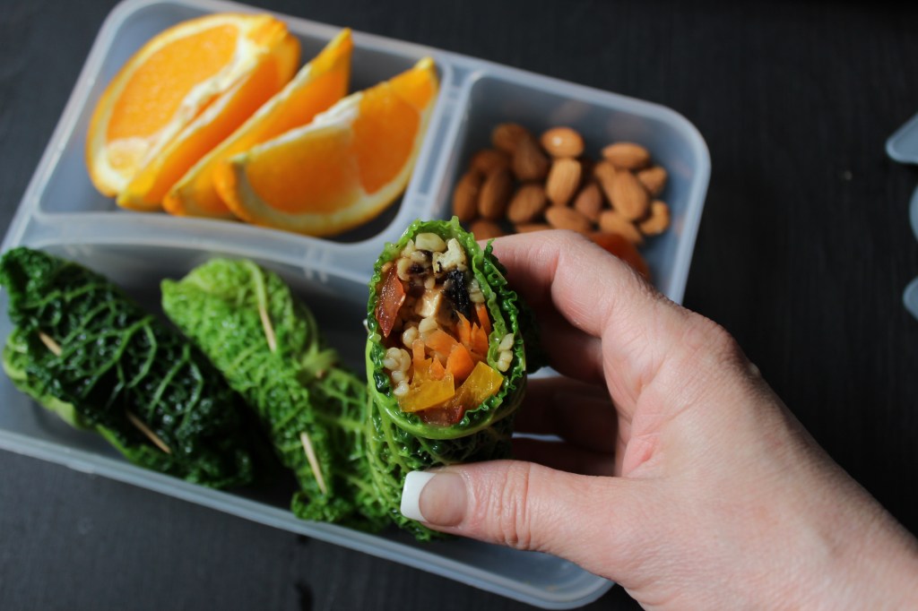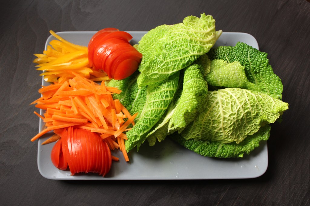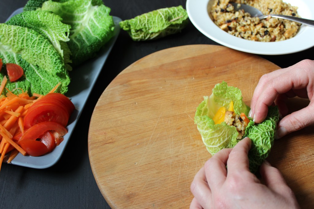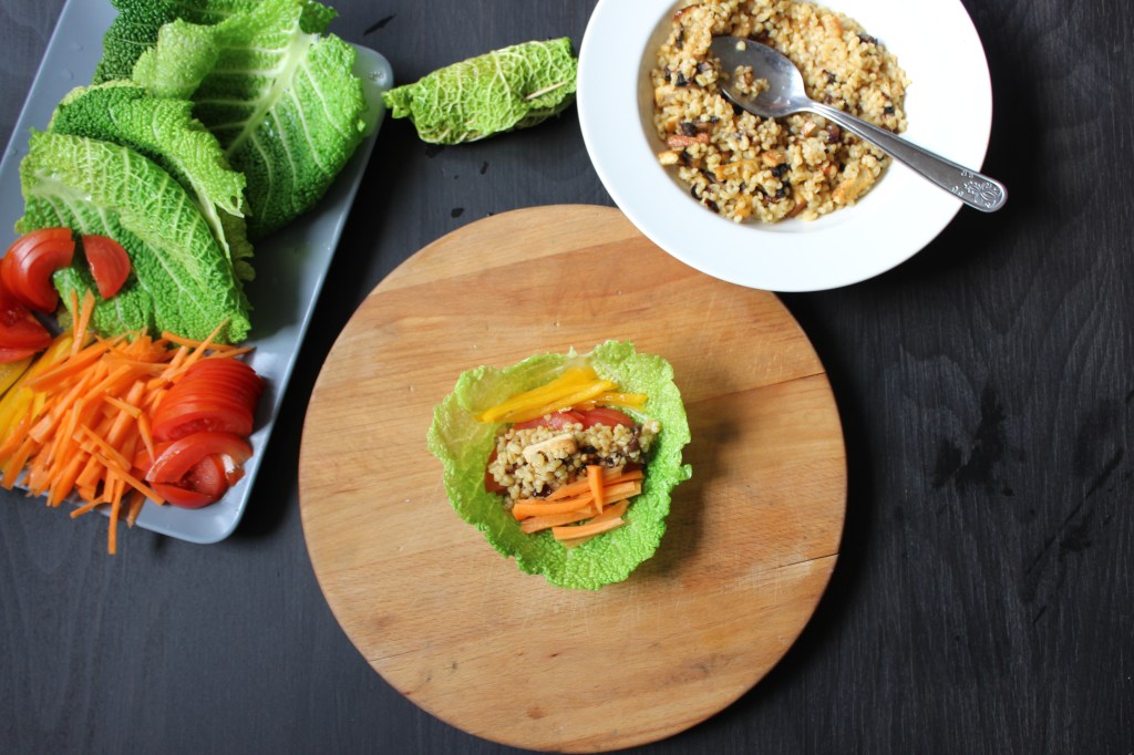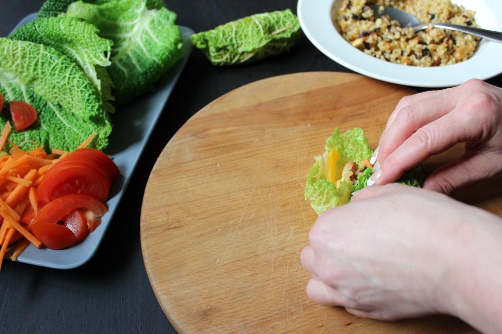 Naskládáš rajčata, směs bulguru, mrkev, papriku, zamotáš jako tortilu a sešpendlíš párátkem , je to jednoduché.