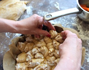- postupně vkládej do pekáčku a každý potři rozpuštěným máslem ( vždy budeš mít nahoře takové dva smotané šneky )